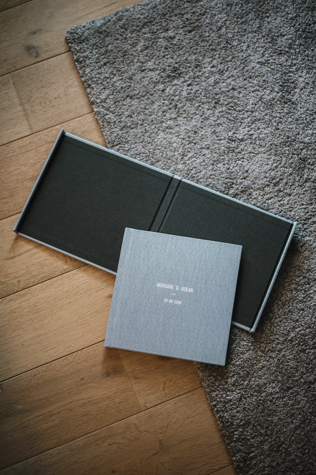 Album avec ouverture classique, pages souples + boite rigide en toile de lin avec impression