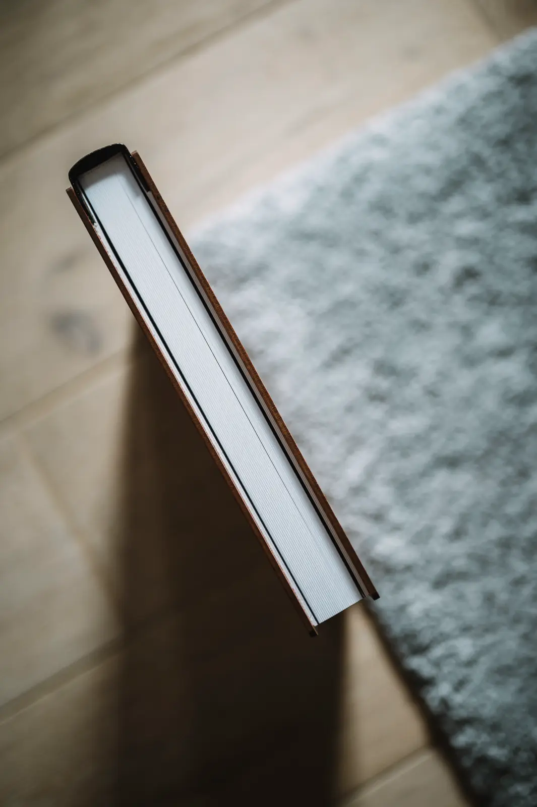 Album avec ouverture à plat, pages rigides avec une couverture en bois gravé