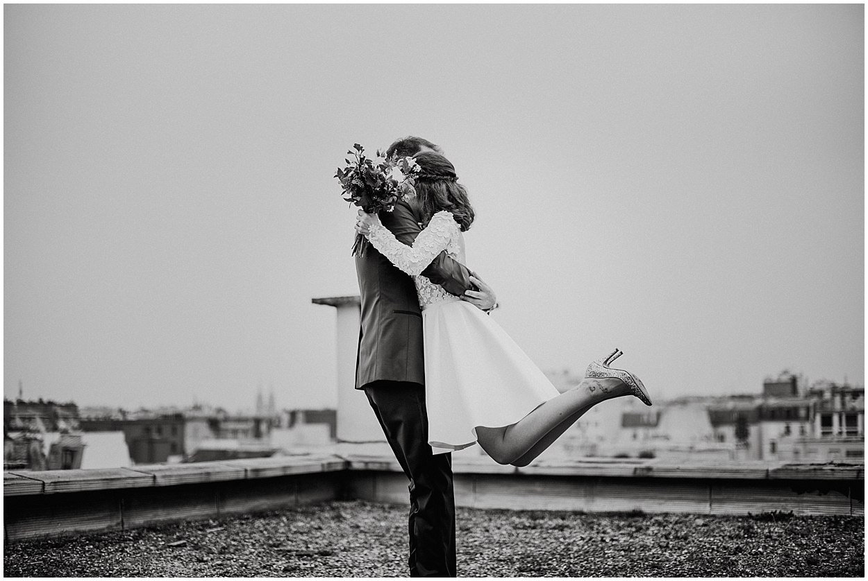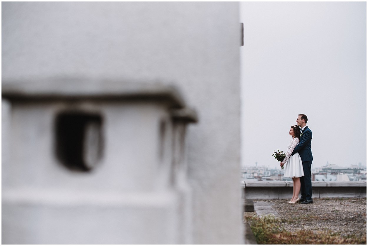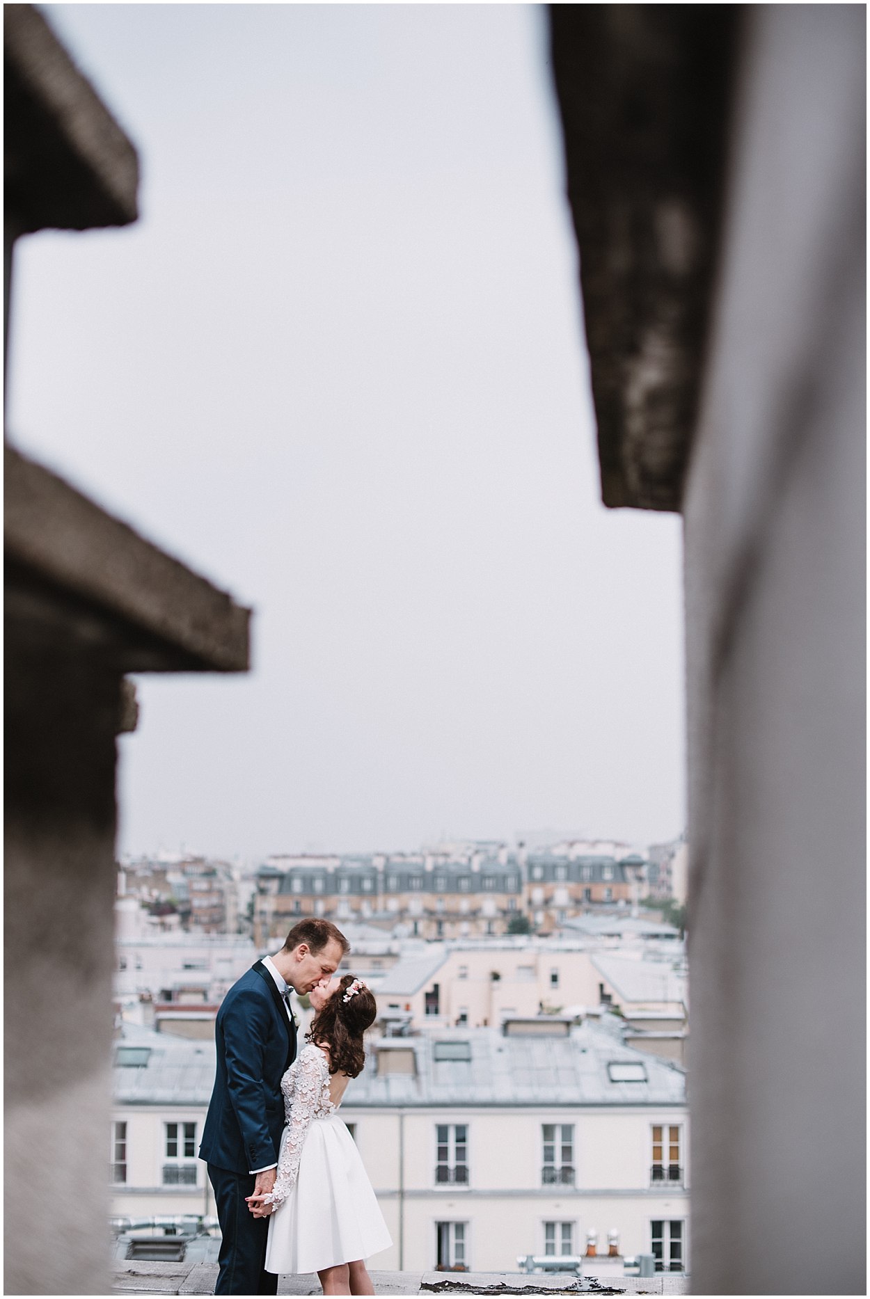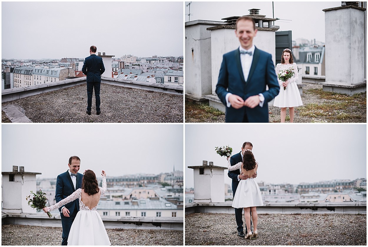 Pour leur « first look » Émilie et Hector ont eu la possibilité de monter sur le toit de leur immeuble ! Vous imaginez ma joie lorsqu’ils m’ont dit que c’était possible. Un lieu unique pour faire cette découverte au-dessus des toits et en dominant tout Paris. Le toit était suffisamment grand pour varier les prises de vue. Exceptionnel de pouvoir faire cela !