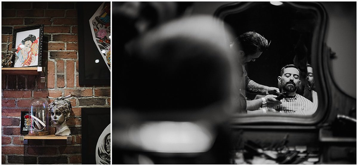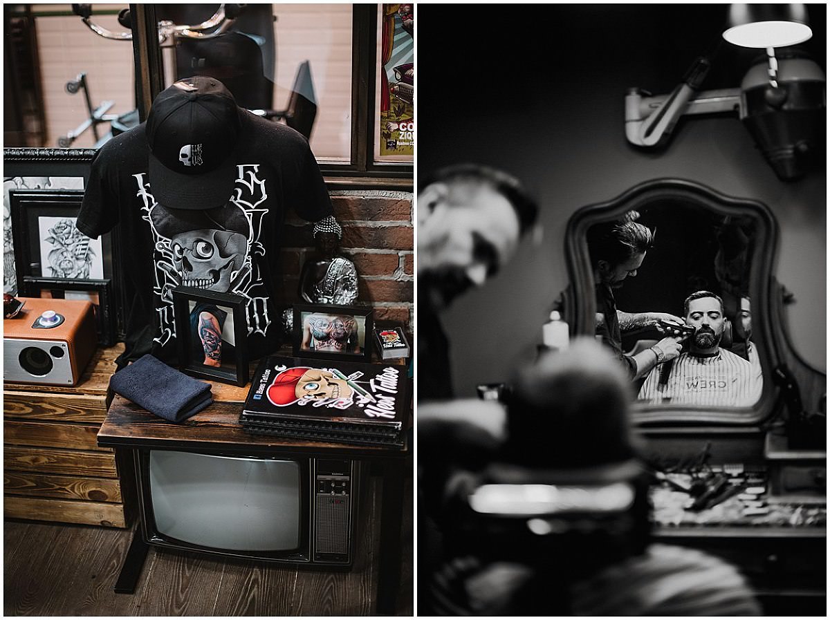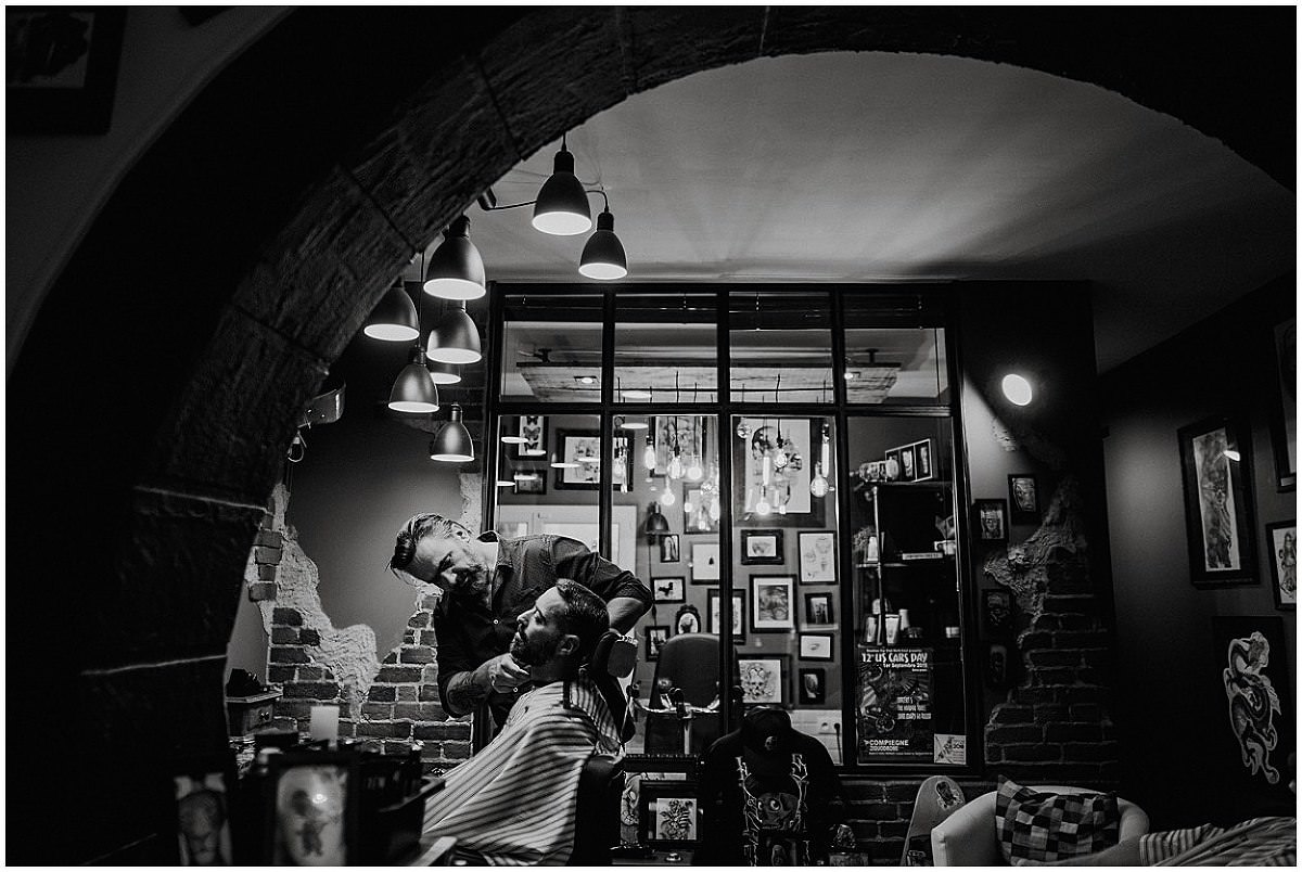 Nous nous sommes retrouvés le matin à Compiègne au Barbier de sa Ville. Fabrice, barbu, je lui avait proposé de se préparer dans ce salon au look charmant et rétro qu’il connaissait déjà pour en être client. J’ai adoré voir le responsable de ce salon lui tailler la barbe avec une dextérité et une gestuel assurée que j’avais déjà remarqué lors d’un mariage précédent.