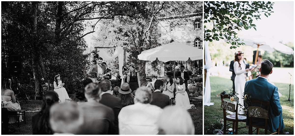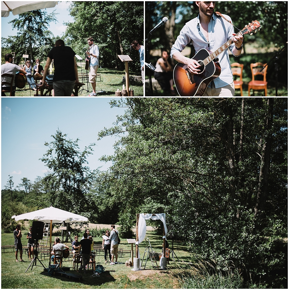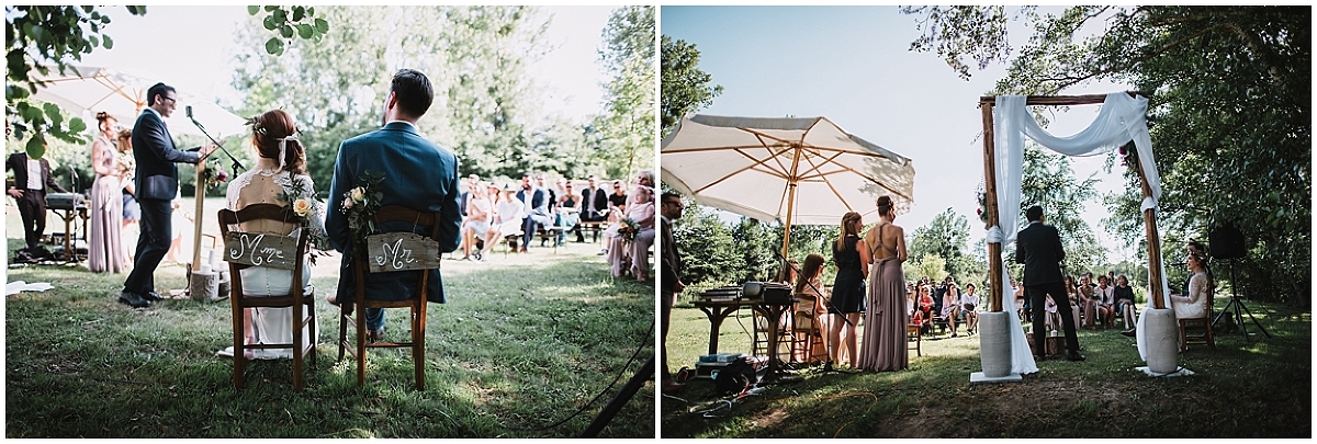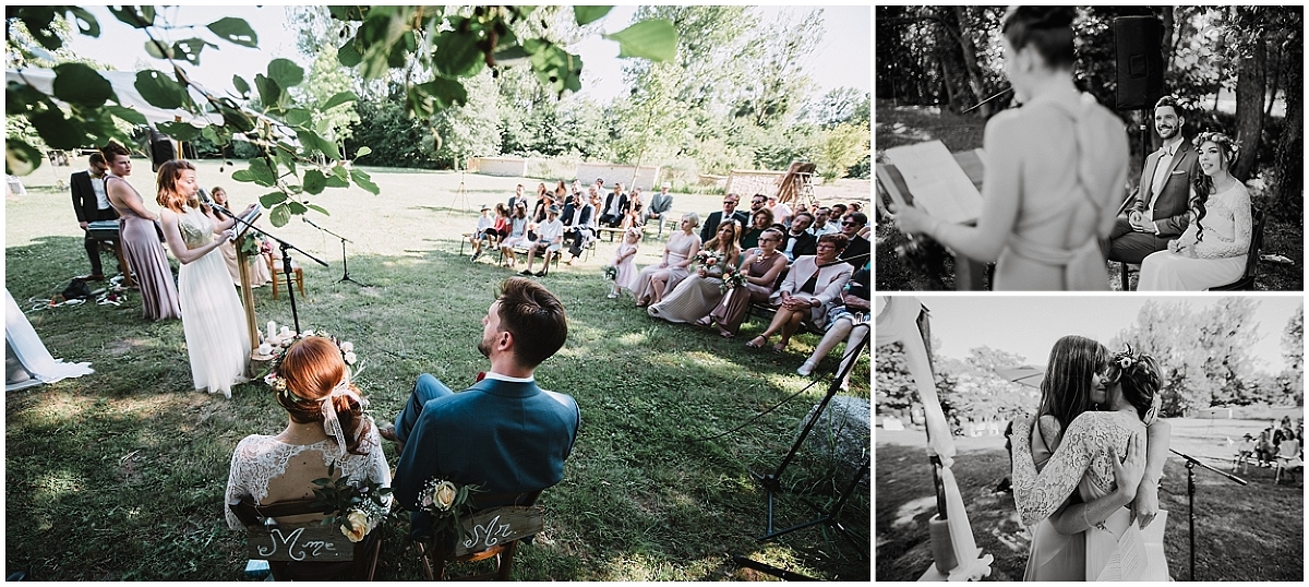 Ils avaient choisi de faire une cérémonie laïque. Ce fût sans doute l’une des cérémonies les plus réussies à laquelle j’ai assisté. Entre les discours, il y avait beaucoup de musiques et de chants interprétés par Marion et Gaël ou leurs amis. Quelle chance de pouvoir témoigner son amour en chansons ! Émotions et éclats de rires ont jonchés toute la cérémonie !