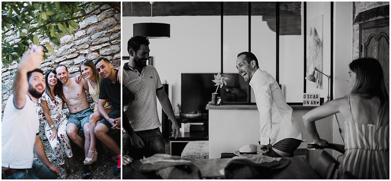 Je me suis donc rendu au domicile de Pauline et Fabien au cœur de Gevrey Chambertin pour les préparatifs de Fabien. C’est dans cette jolie maison de ville, avec pierres et poutres apparentes, au charme fou que Fabien, accompagné de ses amis s’est préparé en toute décontraction. Fou rire, déconnades ont été de mise tout au long des préparatifs mais aussi avec émotions puisqu’un être très cher à Fabien étant parti trop tôt…