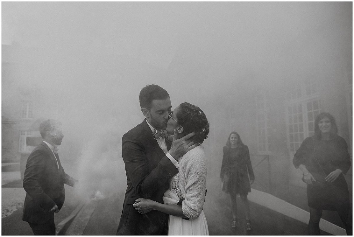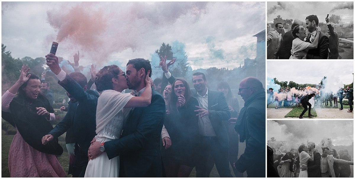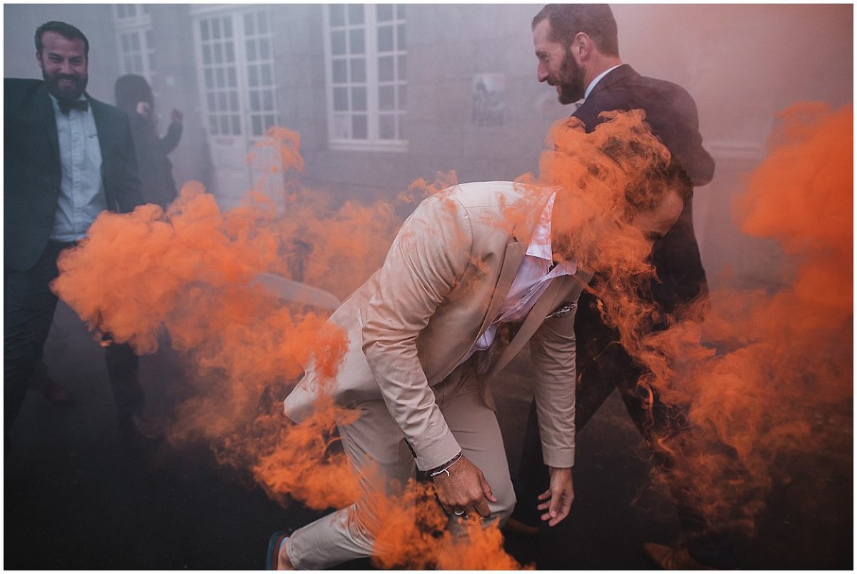 Après la cérémonie religieuse, le cocktail et la soirée a eu lieu à la salle Polinière qui est au sein du Musée municipal de Vire. Durant les photos traditionnelles de groupe, et malgré quelques gouttes de pluie, j’ai emmené tout le groupe d’amis au niveau du square où nous avons utilisé des fumigènes pour créer une ambiance un peu dingue et de franches rigolades autour des jeunes mariés.