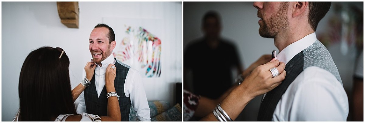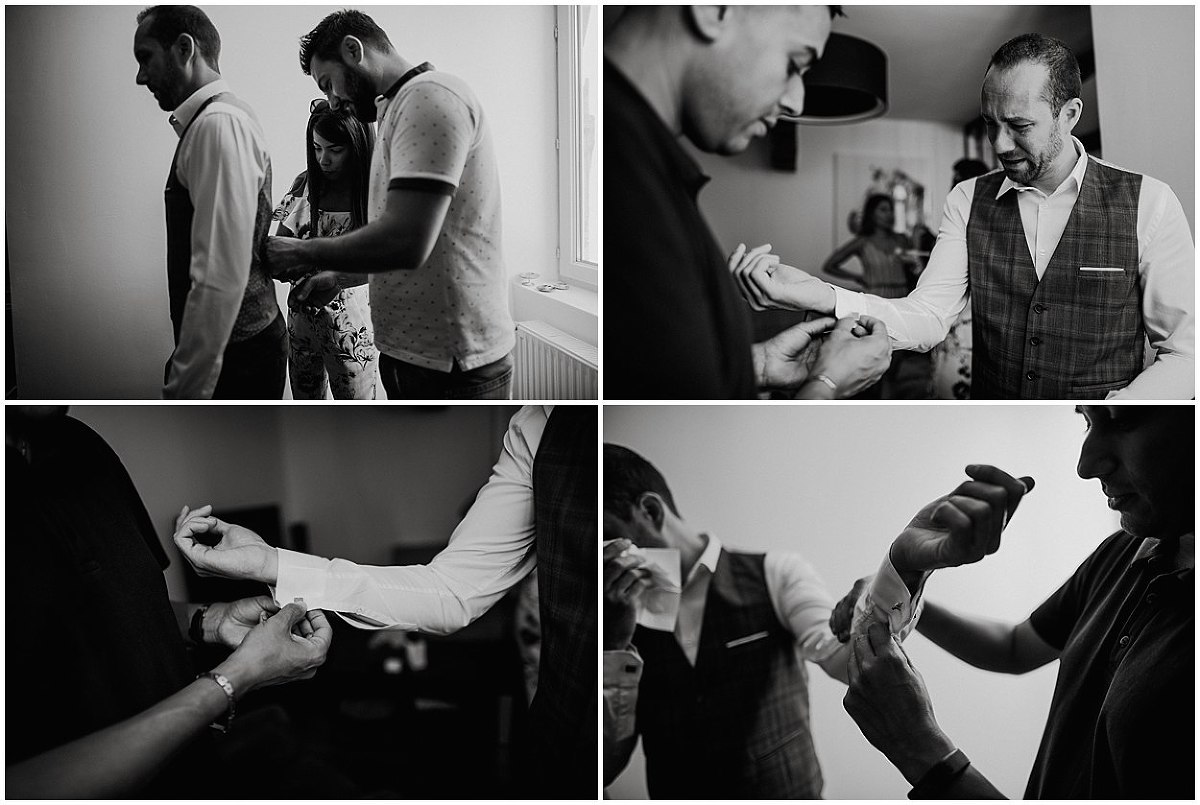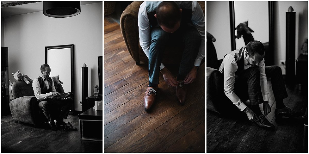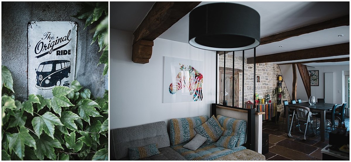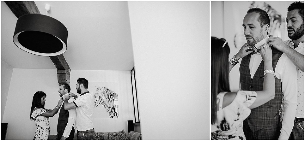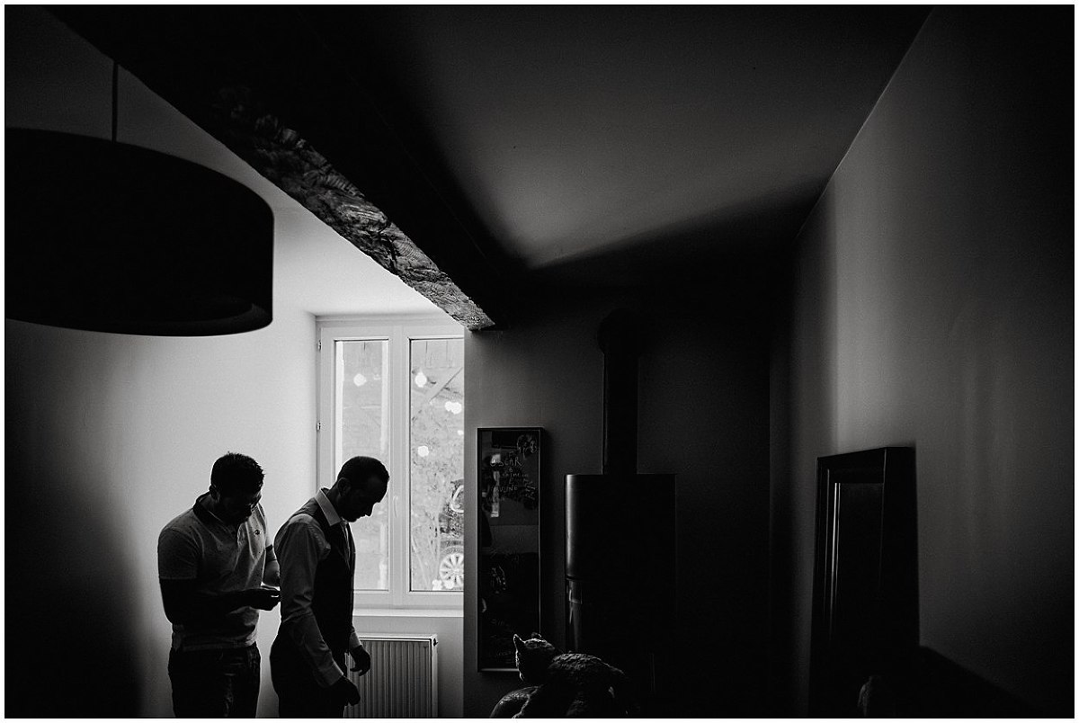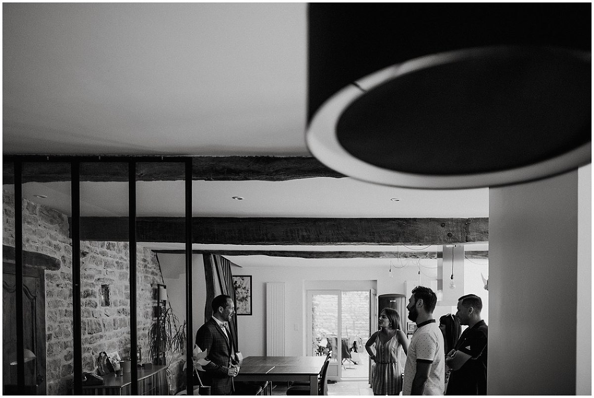 Je me suis donc rendu au domicile de Pauline et Fabien au cœur de Gevrey Chambertin pour les préparatifs de Fabien. C’est dans cette jolie maison de ville, avec pierres et poutres apparentes, au charme fou que Fabien, accompagné de ses amis s’est préparé en toute décontraction. Fou rire, déconnades ont été de mise tout au long des préparatifs mais aussi avec émotions puisqu’un être très cher à Fabien étant parti trop tôt…